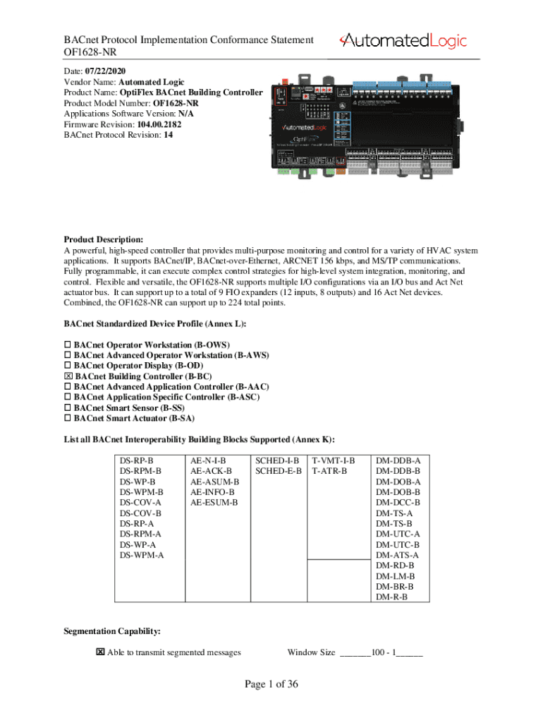 Backed Protocol Implementation Conformance Statement OF1628NR Date: 07/22/2020 Vendor Name: Automated Logic Product Name: OptiPlex Backed Building Controller Product Model Number: OF1628NR Applications