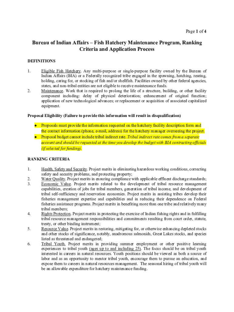 Page 1 of 4Bureau of Indian Affairs Fish Hatchery Maintenance Program, Ranking Criteria and Application Process DEFINITIONS 1. Eligible Fish Hatchery. Any multipurpose or single purpose facility owned