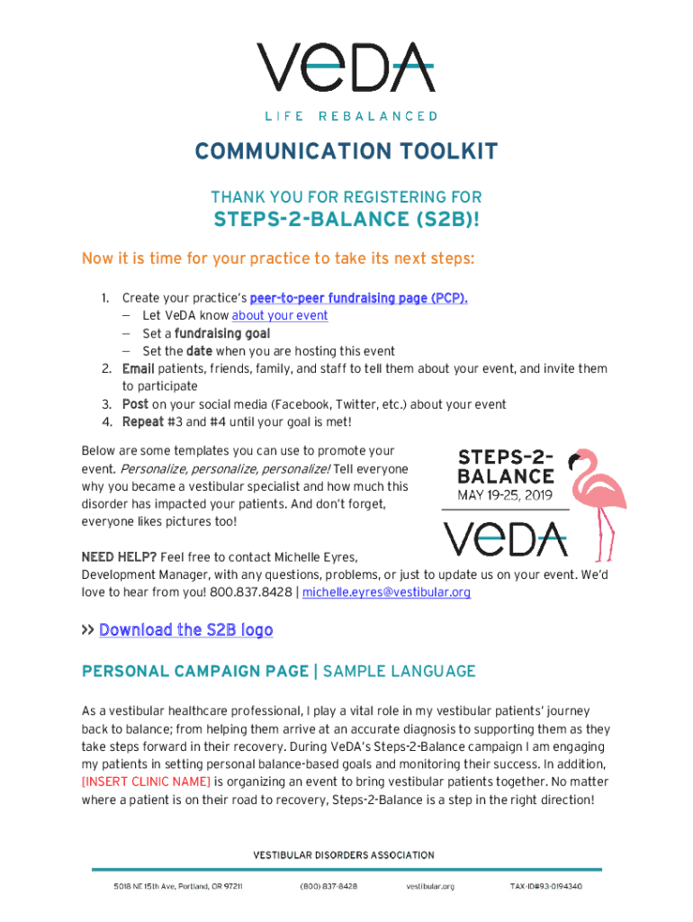 COMMUNICATION TOOLKIT THANK YOU FOR REGISTERING FORSTEPS2BALANCE (S2B)! Now it is time for your practice to take its next steps: 1. Create your practices peertopeer fundraising page (PCP). Let Veda