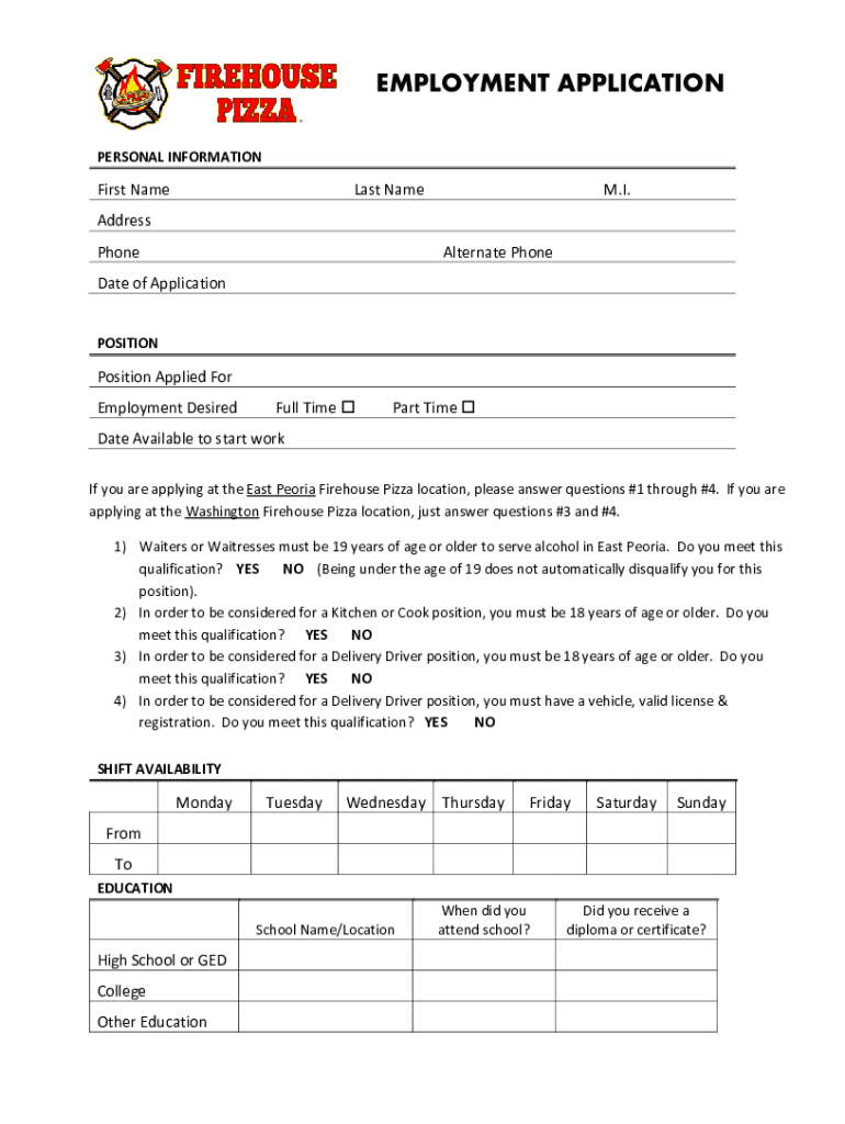 Get the free Employment Application - Firehouse Pizza