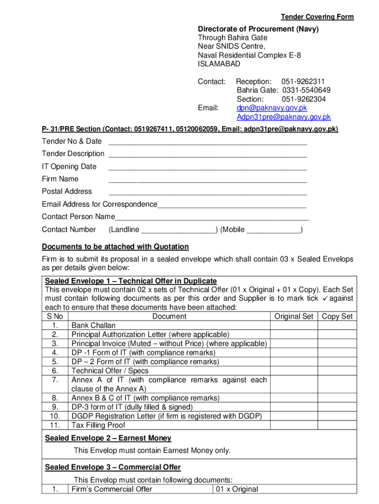 Tender Covering FormDirectorate of Procurement (Navy) Through Bahia Gate Near SIDS Center, Naval Residential Complex E8 ISLAMABAD Contact:Email:Reception: 0519262311 Bahia Gate: 03315540649 Section: