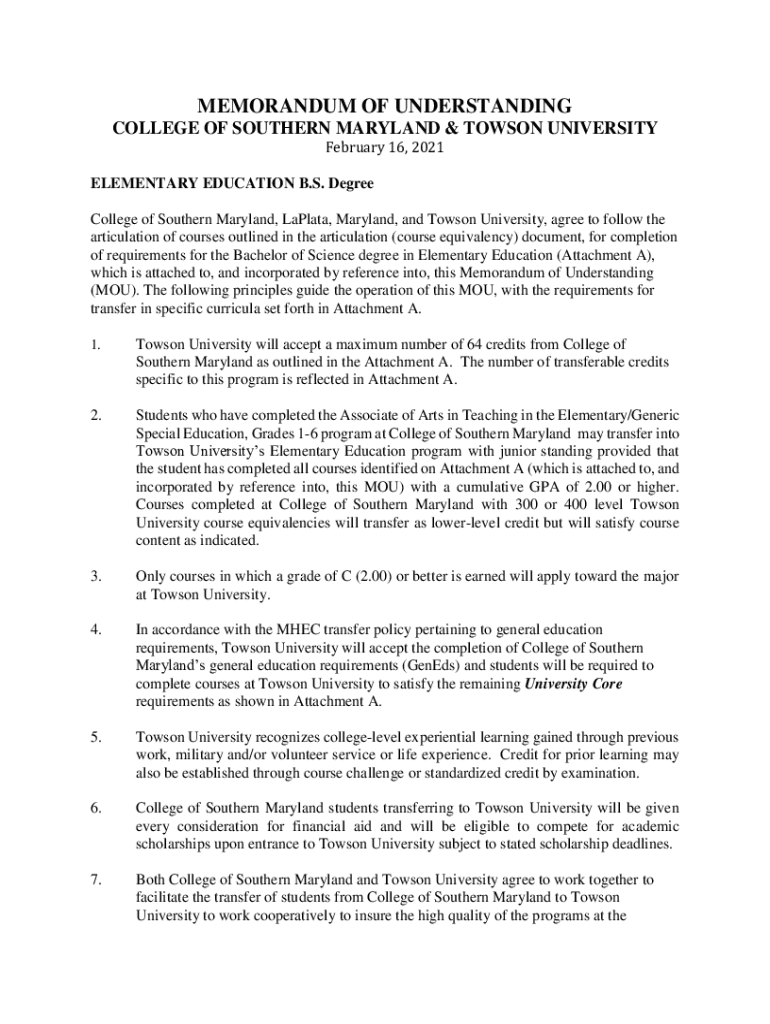 MEMORANDUM OF UNDERSTANDING COLLEGE OF SOUTHERN MARYLAND & TOWSON UNIVERSITY February 16, 2021, ELEMENTARY EDUCATION B.S. Degree College of Southern Maryland, Laplace, Maryland, and Towson University,