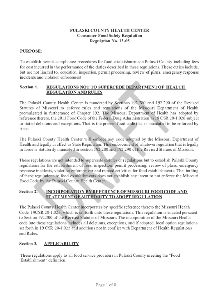 PULASKI COUNTY HEALTH CENTER Consumer Food Safety Regulation No. 1305 PURPOSE: To establish permit compliance procedures for food establishments in Pulaski County including fees for cost incurred