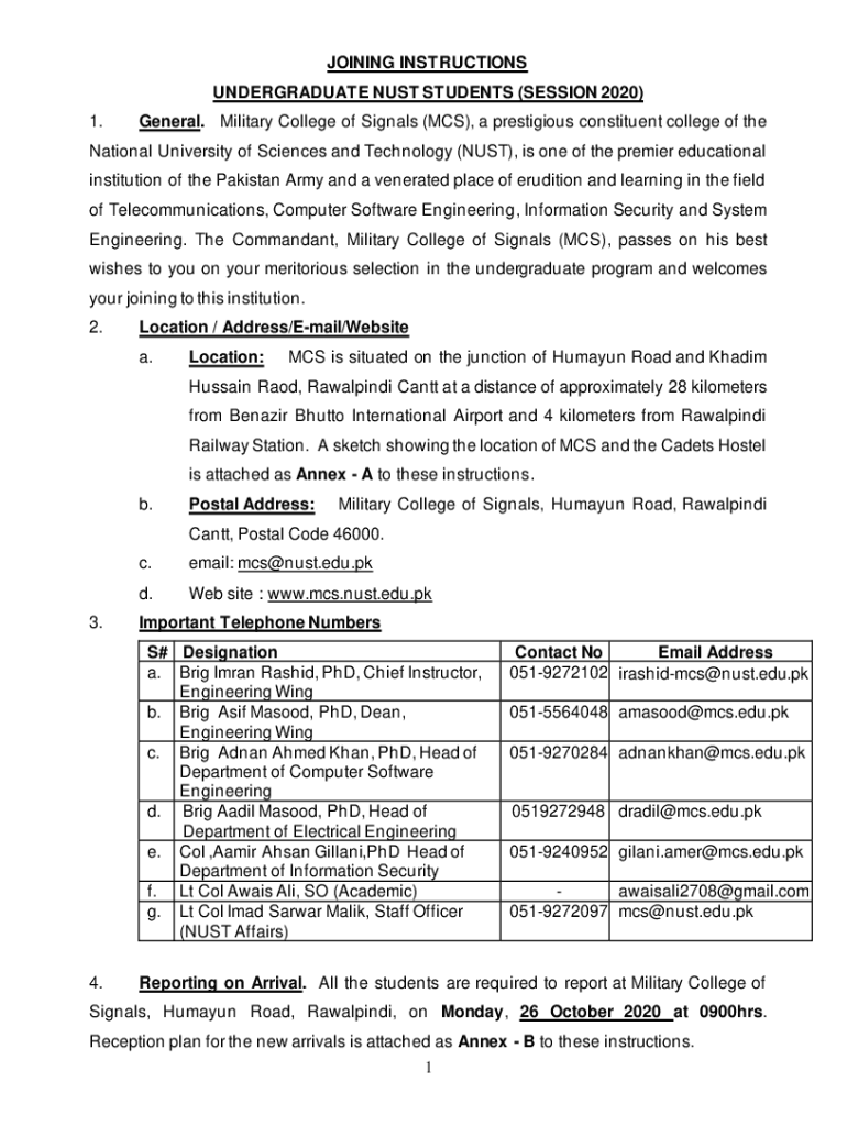 JOINING INSTRUCTIONS UNDERGRADUATE MUST STUDENTS (SESSION 2020) 1. General. Military College of Signals (MCS), a prestigious constituent college of national University of Sciences and Technology (MUST),