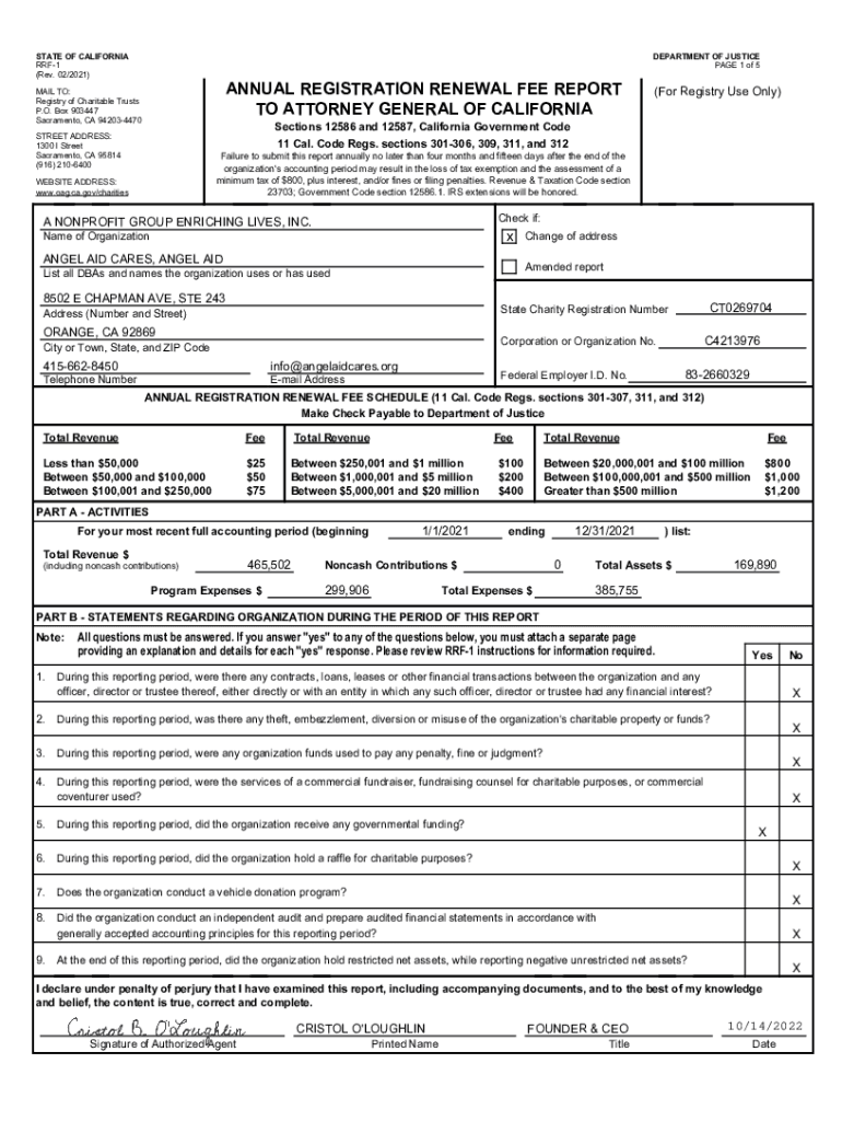 STATE OF CALIFORNIA RRF1 (Rev. 02/2021)DEPARTMENT OF JUSTICE PAGE 1 of 5ANNUAL REGISTRATION RENEWAL FEE REPORT TO ATTORNEY GENERAL OF CALIFORNIAMAIL TO: Registry of Charitable Trusts P.O. Box 903447