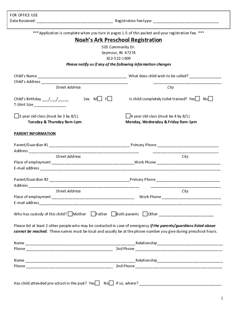 FOR OFFICE Sedate Received: ___Registration fee type: ___***Application is complete when you turn in pages 15 of this packet and your registration fee. ***Noah's Ark Preschool Registration505 Community