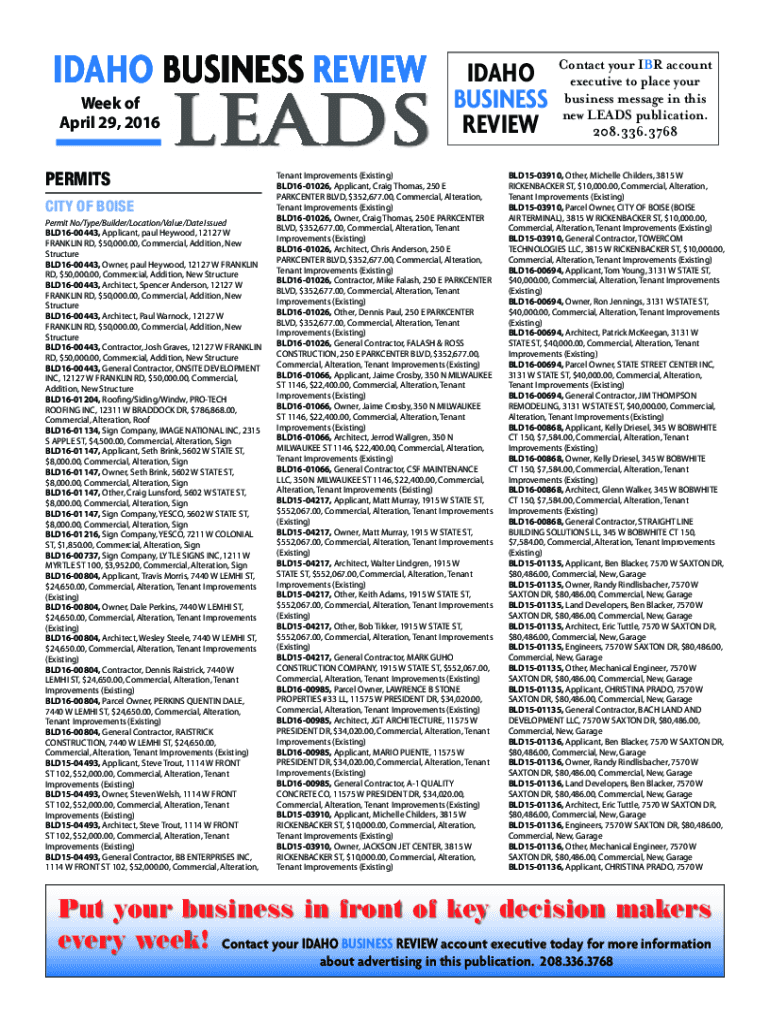 ID IDAHO AHO BUSINESS REVIEW Week of April 29, 2016PERMITS PERMITSLEADSCITY OF BOISE Permit No/Type/Builder/Location/Value/Date Issued CITY OF BOISEBLD1500780, Roofing/Siding/Wind, HOBSON FABRICATING