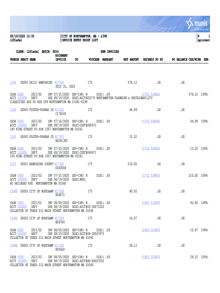 08/19/2020 12:55 1281adel|CITY OF NORTHAMPTON, MA LIVE |INVOICE ENTRY PROOF LIST|P 1 |apinventCLERK: 1281adelBATCH: 9256 NEW INVOICES DOCUMENT VENDOR REMIT NAME INVOICE PO VOUCHER WARRANT NET AMOUNT