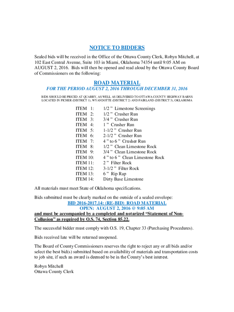 NOTICE TO BIDDERS Sealed bids will be received in the Office of the Ottawa County Clerk, Robyn Mitchell, at 102 East Central Avenue, Suite 103 in Miami, Oklahoma 74354 until 9:05 AM on AUGUST 2, 2016.