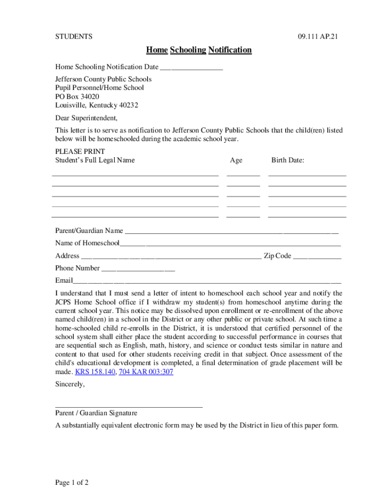 STUDENTS09.111 AP.21Home Schooling Notification Homeschooling Notification Date ___ Jefferson County Public Schools Pupil Personnel/Home School PO Box 34020 Louisville, Kentucky 40232 Dear Superintendent,