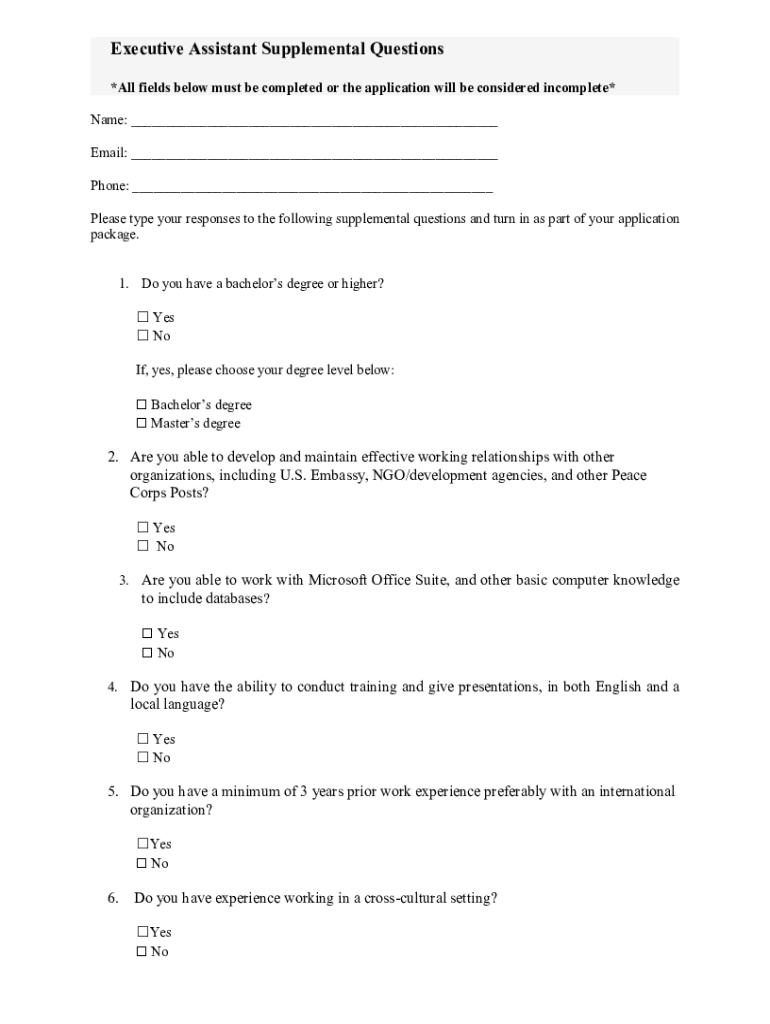 Executive Assistant Supplemental Questions *All fields below must be completed or the application will be considered incomplete* Name: ___ Email: ___ Phone: ___ Please type your responses to the following