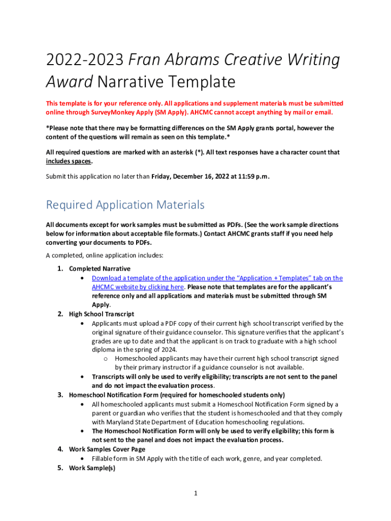 20222023 Fran Abrams Creative Writing Award Narrative Template This template is for your reference only. All applications and supplement materials must be submitted online through SurveyMonkey Apply