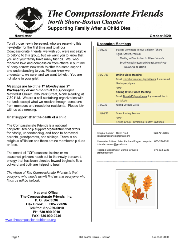 Newsletter October 2020To all those newly bereaved, who are receiving this newsletter for the first time and to all our Compassionate Friends, we wish you were not eligible to belong to this group,