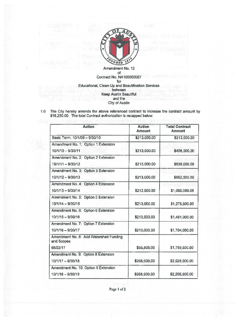 Amendment No. 12 of Contract No. NA100000067 for Educational, Cleanup and Beautification Services between Keep Austin Beautiful and the City of Austin1.0The City hereby amends the above referenced