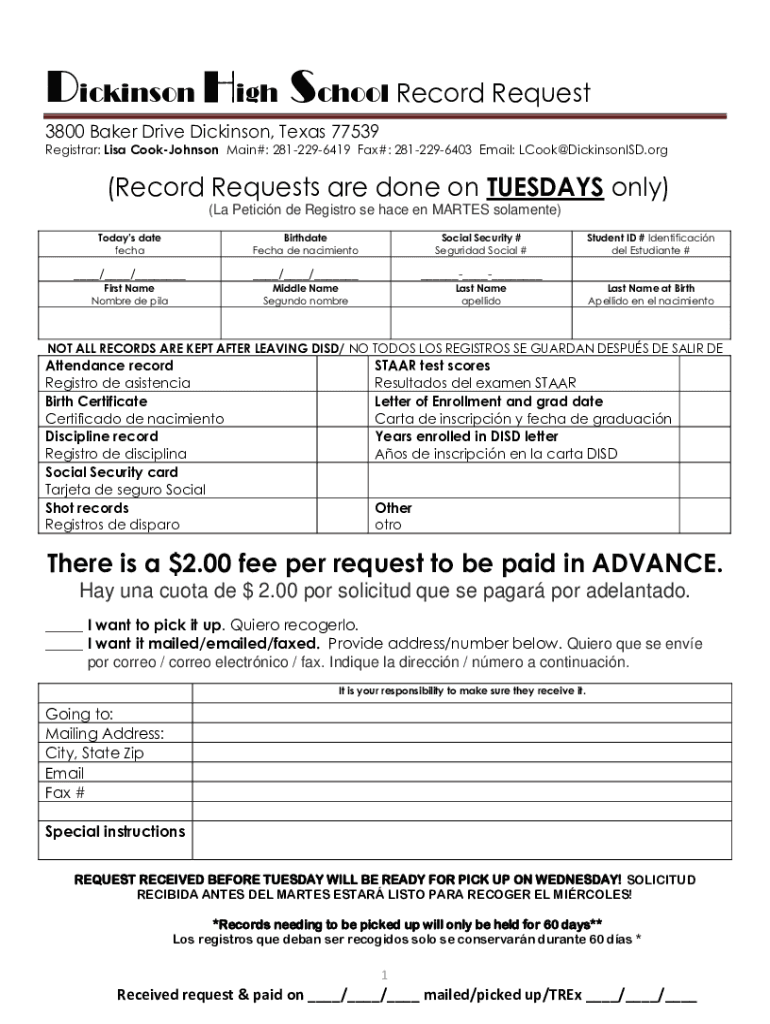 Registrar: Lisa Cook Johnson Main#: 2812296419 Fax#: 2812296403 Email: LCook@DickinsonISD.org(Record Requests are done