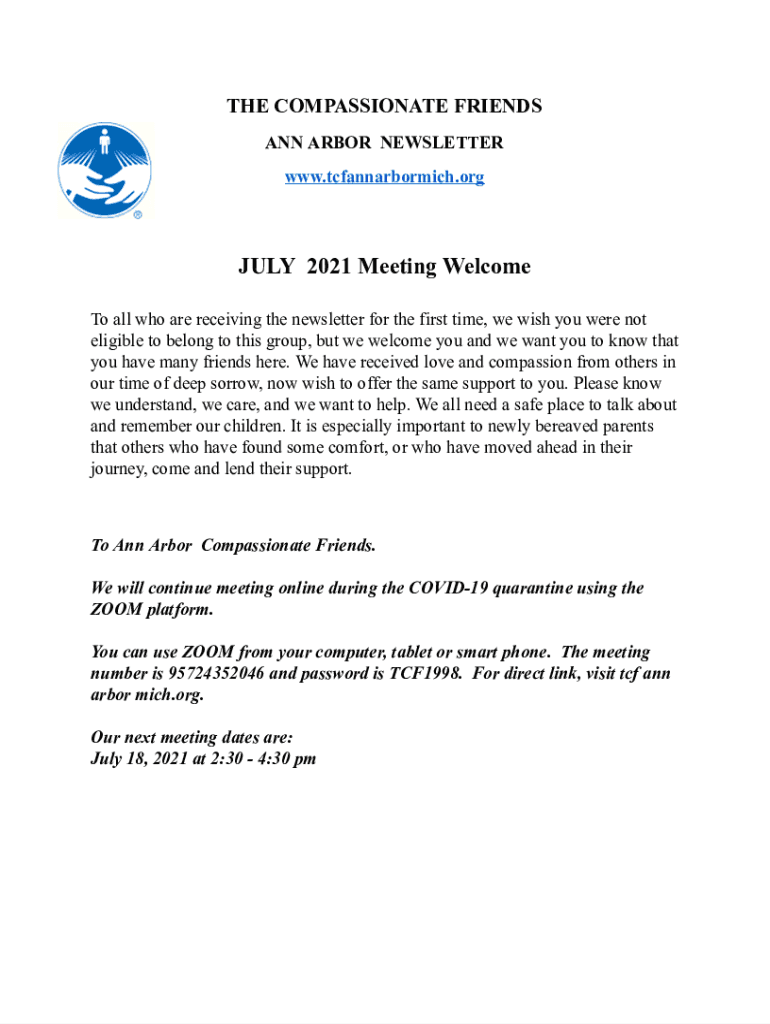 THE COMPASSIONATE FRIENDS ANN ARBOR NEWSLETTER www.tcfannarbormich.orgJULY 2021 Meeting Welcome To all who are receiving the newsletter for the first time, we wish you were not eligible to belong