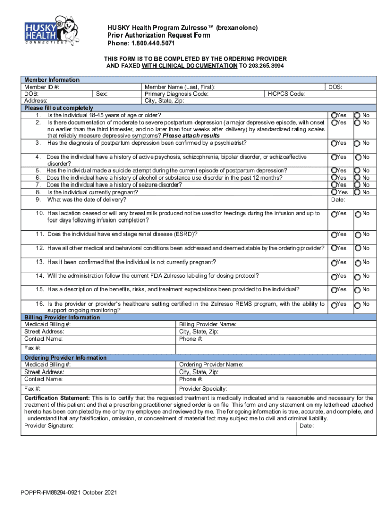 HUSKY Health Program Duress (brexanolone) Prior Authorization Request Form Phone: 1.800.440.5071 THIS FORM IS TO BE COMPLETED BY THE ORDERING PROVIDER AND FAXED WITH CLINICAL DOCUMENTATION TO 203.265.3994