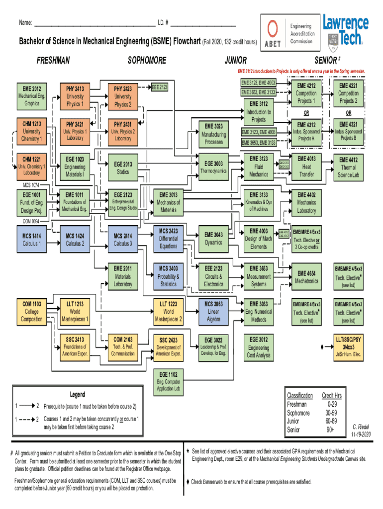 Name: ___ I.D. # ___Bachelor of Science in Mechanical Engineering (SME) Flowchart (Fall 2020, 132 credit hours) FRESHMANSOPHOMOREJUNIORSENIOR #EME 3112 Introduction to Projects is only offered once