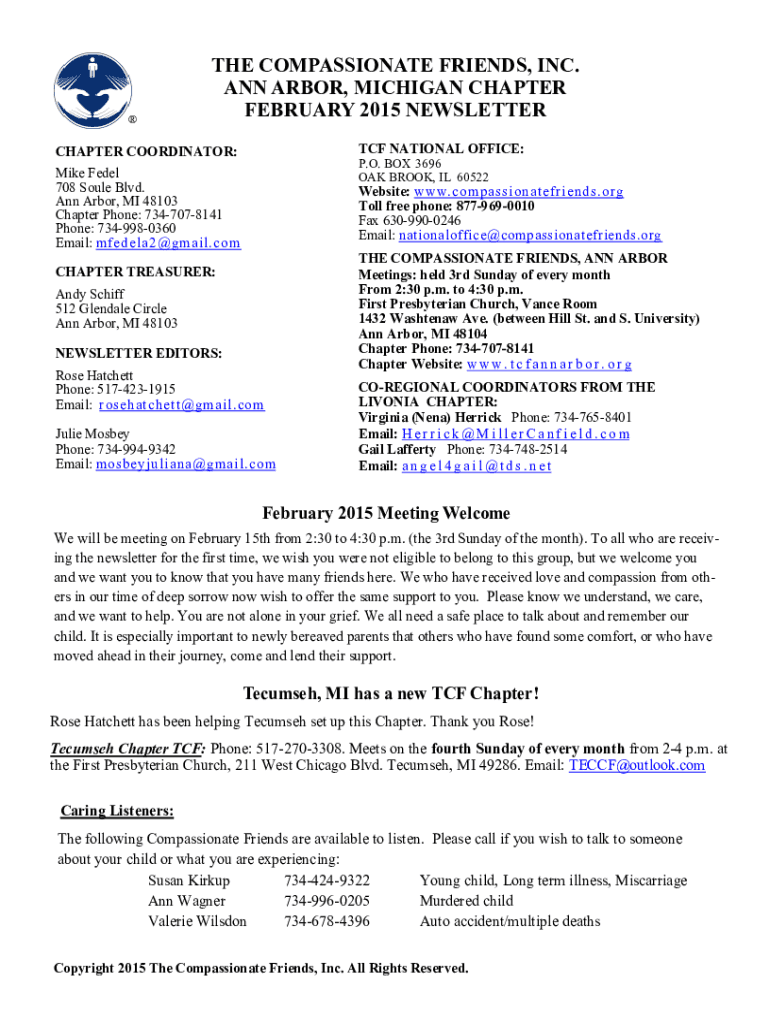THE COMPASSIONATE FRIENDS, INC. ANN ARBOR, MICHIGAN CHAPTER FEBRUARY 2015 NEWSLETTER TCF NATIONAL OFFICE:CHAPTER COORDINATOR: Mike Feel 708 Sole Blvd. Ann Arbor, MI 48103 Chapter Phone: 7347078141