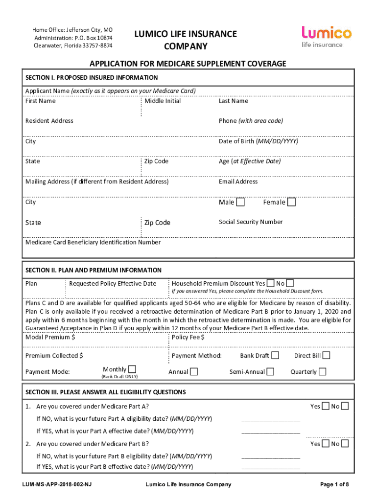 Home Office: Jefferson City, MO Administration: P.O. Box 10874 Clearwater, Florida 337578874LUMICO LIFE INSURANCE COMPANYAPPLICATION FOR MEDICARE SUPPLEMENT COVERAGE SECTION I. PROPOSED INSURED INFORMATION