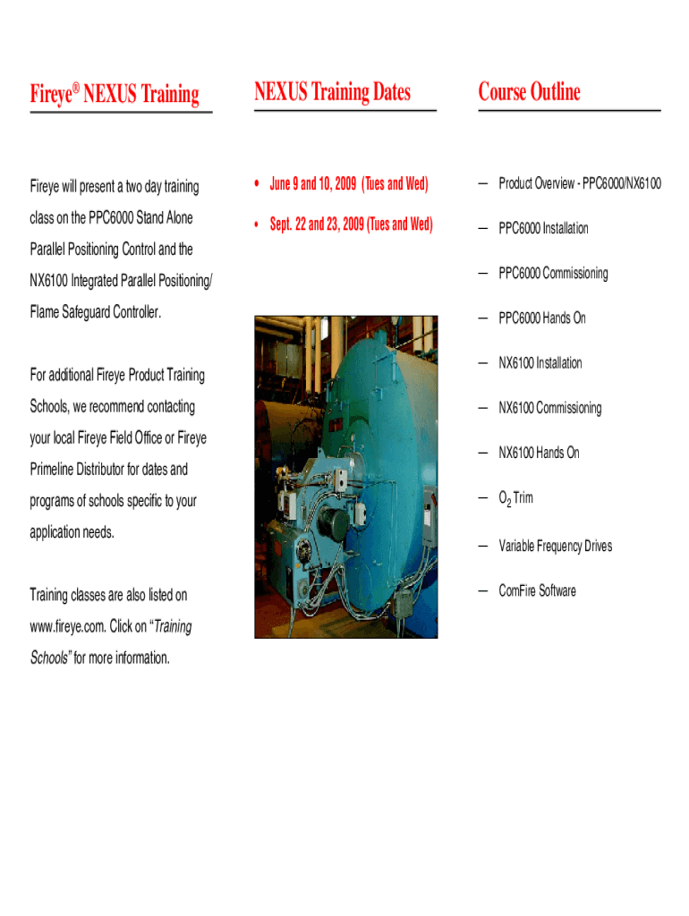 Fir eye NEXUS TrainingNEXUS Training Watercourse OutlineFireye will present a two-day training June 9 and 10, 2009 (Tues and Wed)Product Overview PPC6000/NX6100class on the PPC6000 Stand Alone Sept.