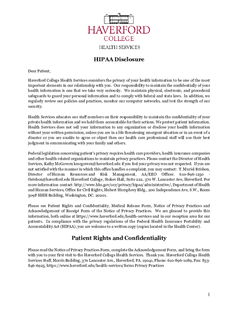 HIPAA Disclosure Dear Patient, Haverford College Health Services considers the privacy of your health information to be one of the most important elements in our relationship with you. Our responsibility