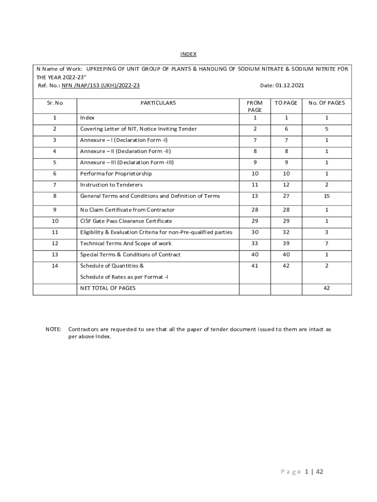 INDEX N Name of Work: UPKEEP ING OF UNIT GROUP OF PLANTS & HANDLING OF SODIUM NITRATE & SODIUM NITRITE FOR THE YEAR 202223 Ref. No.: NON /NAP/153 (UK)/202223 Date: 01.12.2021 Sr. NoPARTICULARSFROM