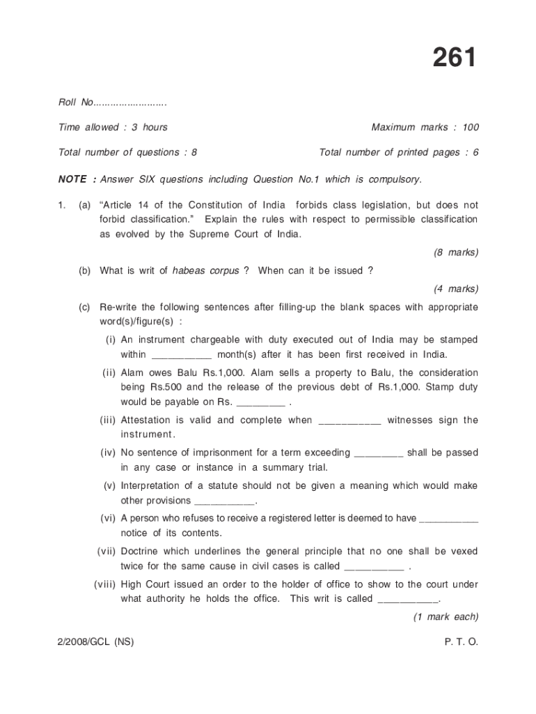 1261:Roll No.......................... Time allowed : 3 hours Total number of questions : 8Maximum marks : 100 Total number of printed pages : 6NOTE : Answer SIX questions including Question No.1