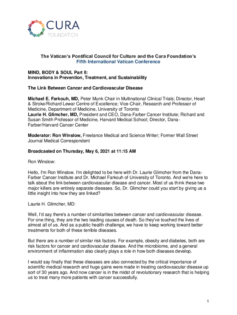 The Vatican's Pontifical Council for Culture and the Cuba Foundations Fifth International Vatican Conference MIND, BODY & SOUL Part II: Innovations in Prevention, Treatment, and Sustainability The