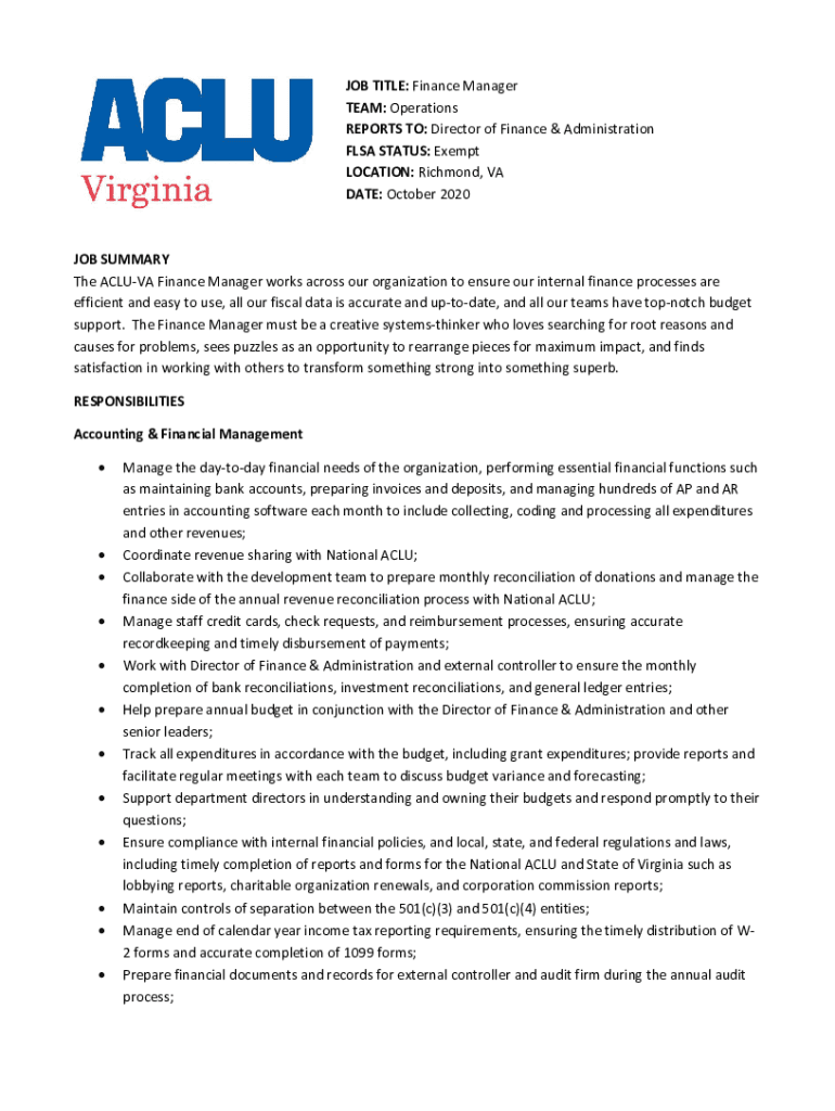 JOB TITLE: Finance Manager TEAM: Operations REPORTS TO: Director of Finance & Administration FLEA STATUS: Exempt LOCATION: Richmond, VA DATE: October 2020JOB SUMMARY The ACL UVA Finance Manager works