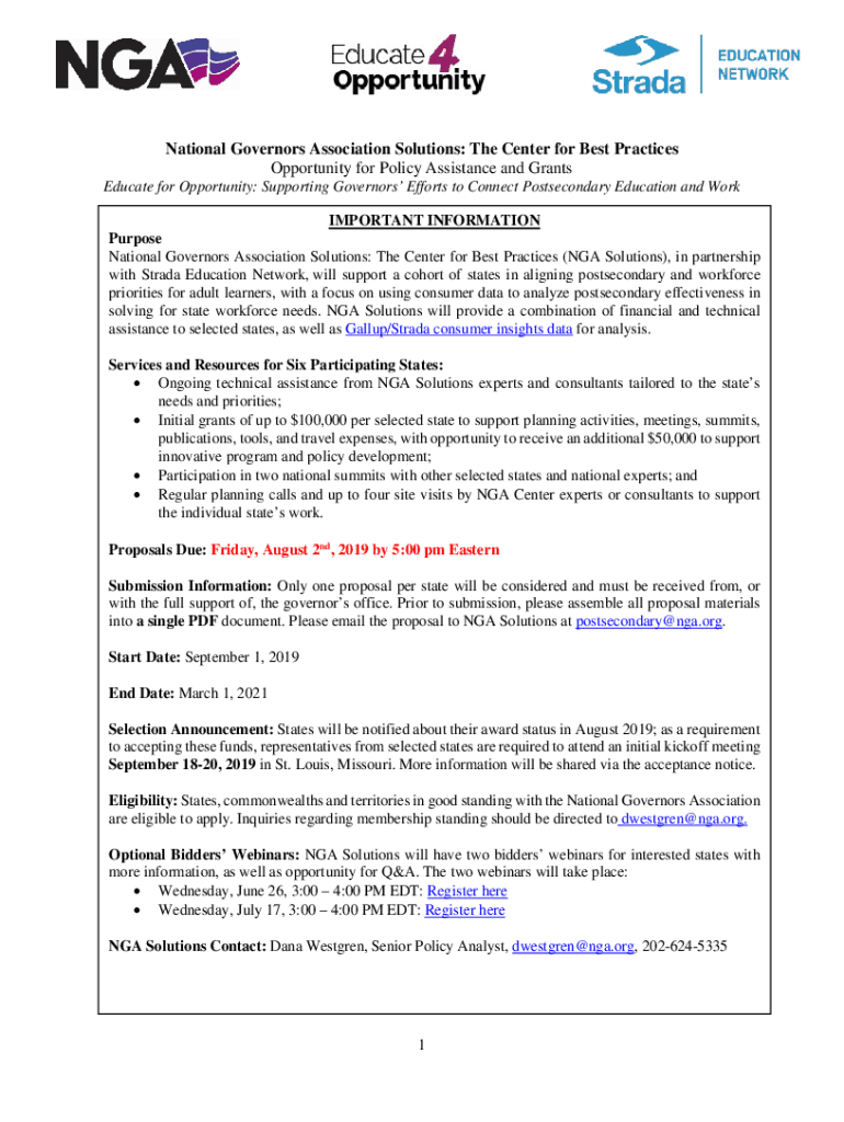 National Governors Association Solutions: The Center for Best Practices Opportunity for Policy Assistance and Grants Educate for Opportunity: Supporting Governors Efforts to Connect Postsecondary