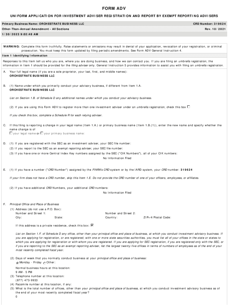 FORM ADV UNIFORM APPLICATION FOR INVESTMENT ADVISER REGISTRATION AND REPORT BY EXEMPT REPORTING ADVISERS Primary Business Name: ORCHESTRATE BUSINESS LLC CRD Number: 319624OtherThanAnnual Amendment