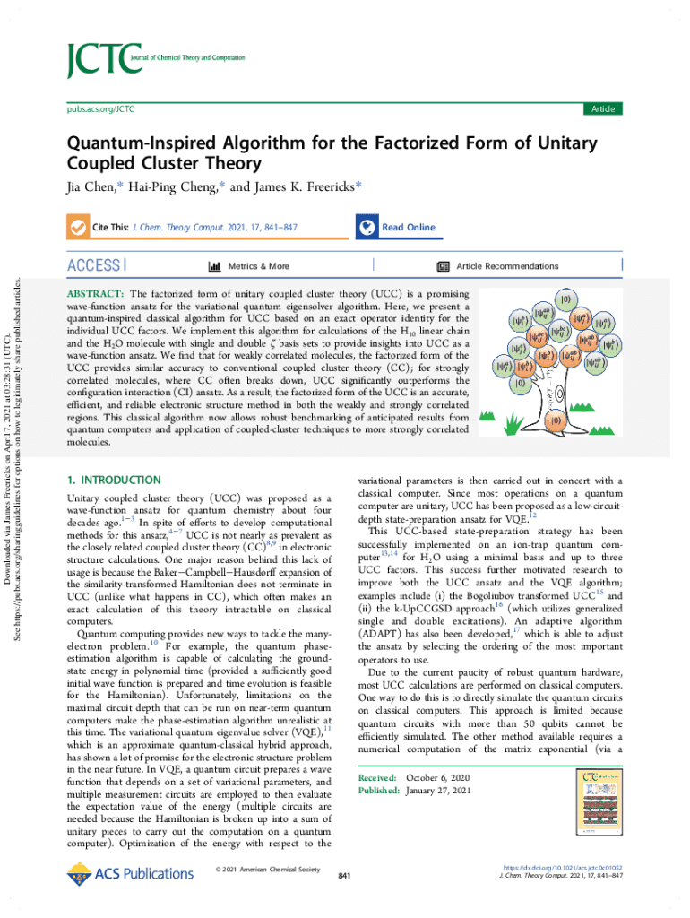 Pubs.acs.org/JCTCArticleQuantumInspired Algorithm for the Factorized Form of Unitary Coupled Cluster Theory Via Chen, * Hailing Cheng, * and James K. Free ricks* Cite This: J. Chem. Theory Compute.