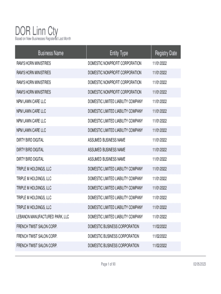 FOR Line Based on New Businesses Registered Last MonthBusiness Amenity TypeRegistry Date RAM\'S HORN MINISTRIESDOMESTIC NONPROFIT CORPORATION11/01/2022RAM\'S HORN MINISTRIESDOMESTIC NONPROFIT CORPORATION11/01/2022RAM\'S