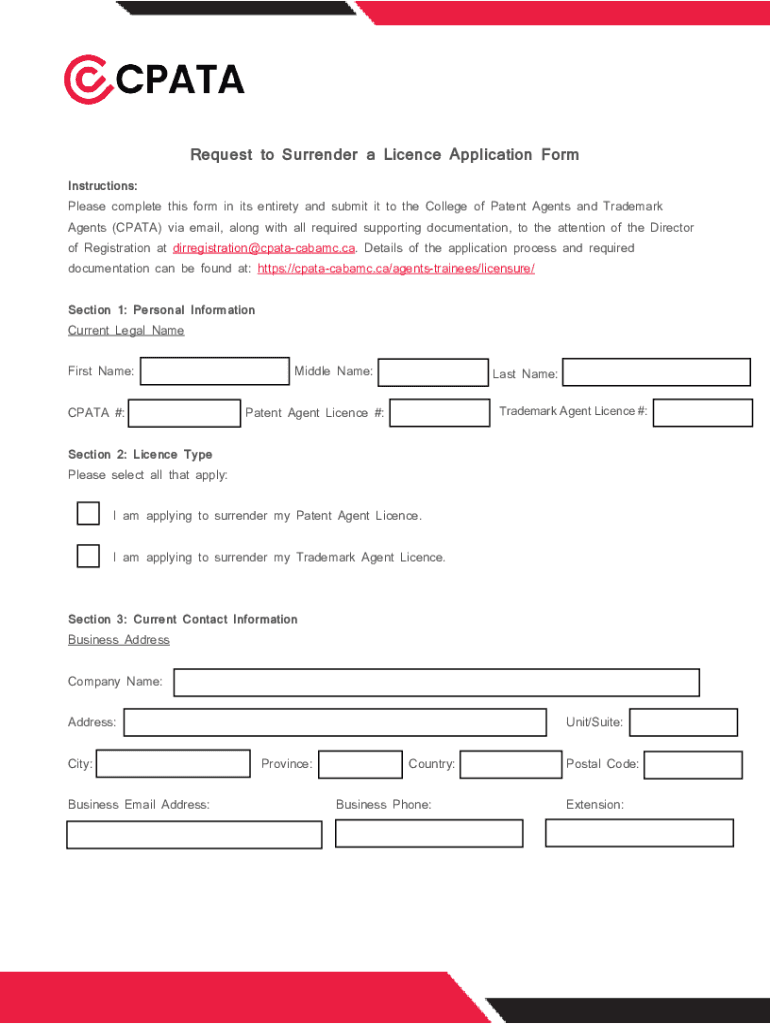 Request to Surrender a License Application Form Instructions:Please complete this form in its entirety and submit it to the College of Patent Agents and Trademark Agents (CPA TA) via email, along