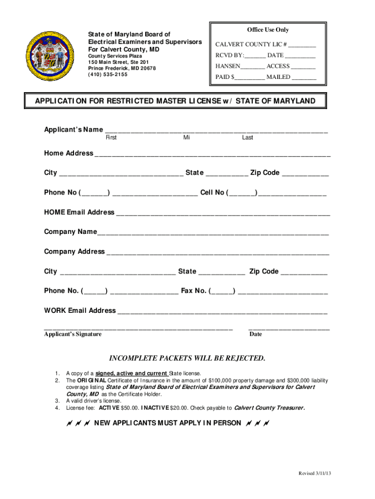 State of Maryland Board of Electrical Examiners and Supervisors For Calvert County, MD County Services Plaza 150 Main Street, Ste 201 Prince Frederick, MD 20678 (410) 5352155Office Use Only CALVERT