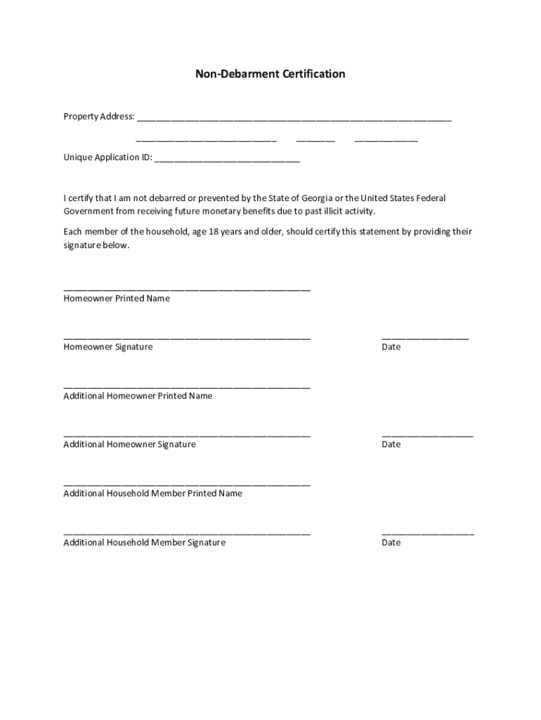 The non-debarment certificate typically requires the individual or entity to provide identifying information, affirm they have not been debarred, and sign the document.