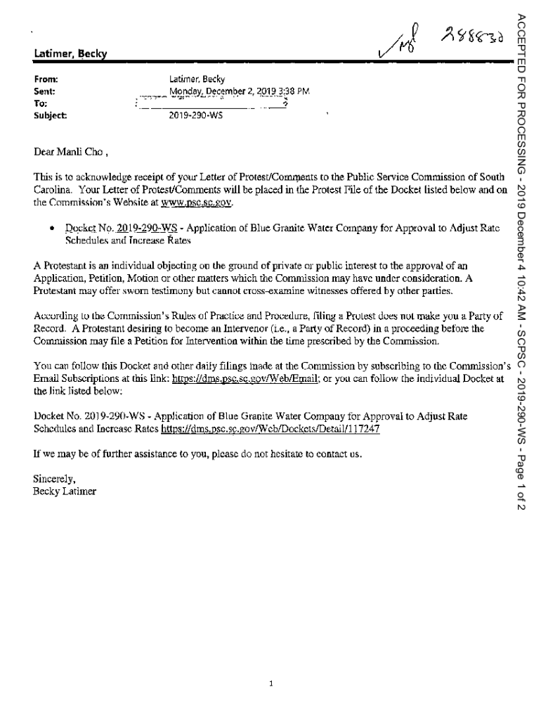 To:Monday, December 2, 2019 3:38 PM Subj etc:2019290WSLatimer, Becker Mali CHO’t. This is to acknowledge receipt of your Letter of Protest/Comments to the Public Service Commission of