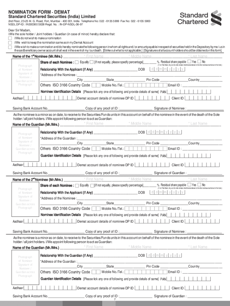 NOMINATION FORM DEM AT Standard Chartered Securities (India) Limited 2nd Floor, 2325 M. G. Road, Fort, Mumbai 400 001. India Telephone No: 022 6135 5999 Fax No: 022 6135 5900 NDDL DID : IN300360 SEMI