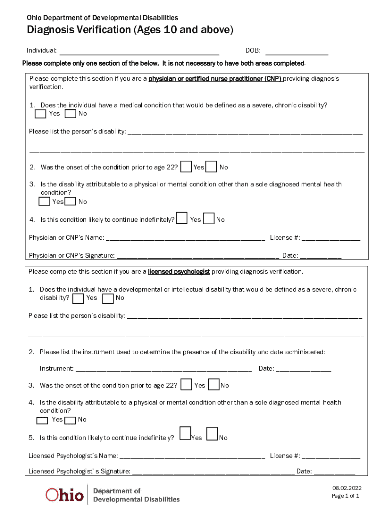 Ohio Department of Developmental DisabilitiesDiagnosis Verification (Ages 10 and above) Individual:DOB:Please complete only one section of the below. It is not necessary to have both areas completed.