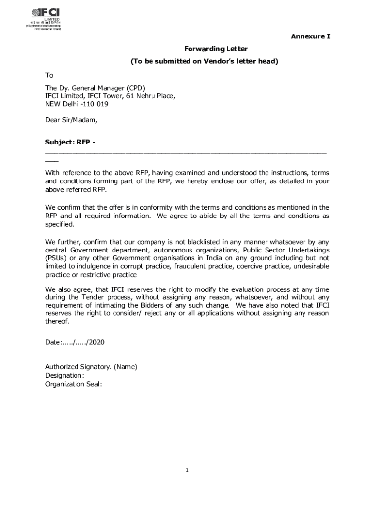Get the free 1 Annexure I Forwarding Letter (To be submitted on Vendor's ... - IFCI