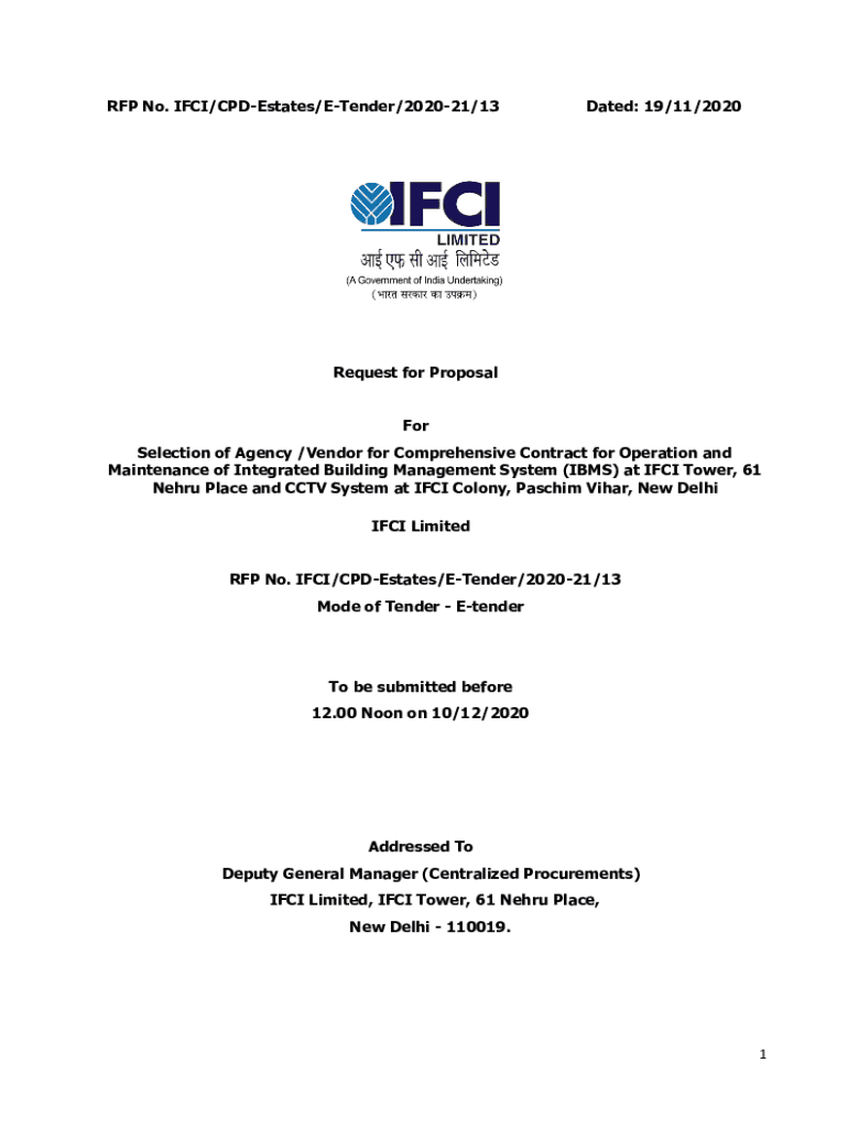 RFP No. IFC/CPDE states/Tender/202021/13Dated: 19/11/2020Request for Proposal For Selection of Agency /Vendor for Comprehensive Contract for Operation and Maintenance of Integrated Building Management