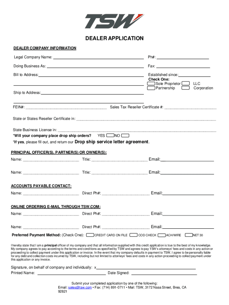 DEALER APPLICATION DEALER COMPANY INFORMATION Legal Company Name:pH#:Doing Business As:Fax:Bill to Address:Established since: Check One: Sole Proprietor Partnership LLC Corporation Ship to Address:VEIN#: