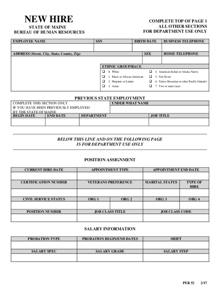 NEW INCOMPLETE TOP OF PAGE 1 ALL OTHER SECTIONS FOR DEPARTMENT USE ONSTAGE OF MAINE BUREAU OF HUMAN RESOURCES EMPLOYEE NAMESSNBIRTH HEADDRESS (Street, City, State, County, Zip)BUSINESS TELEPHONE HOME