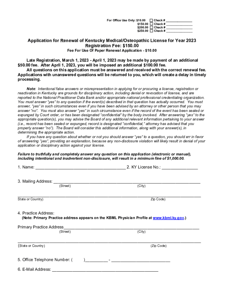 For Office Use Only: $$$$10.00150.00200.00250.00Check # ___ Check # ___ Check # ___ Check # ___Application for Renewal of Kentucky Medical/Osteopathic License for Year 2023 Registration Fee: $150.00