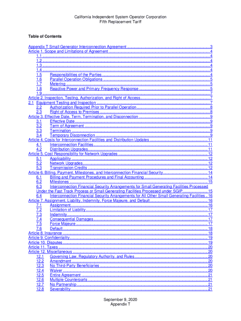 California Independent System Operator Corporation Fifth Replacement TariffTable of Contents Appendix T Small Generator Interconnection Agreement ............................................................................