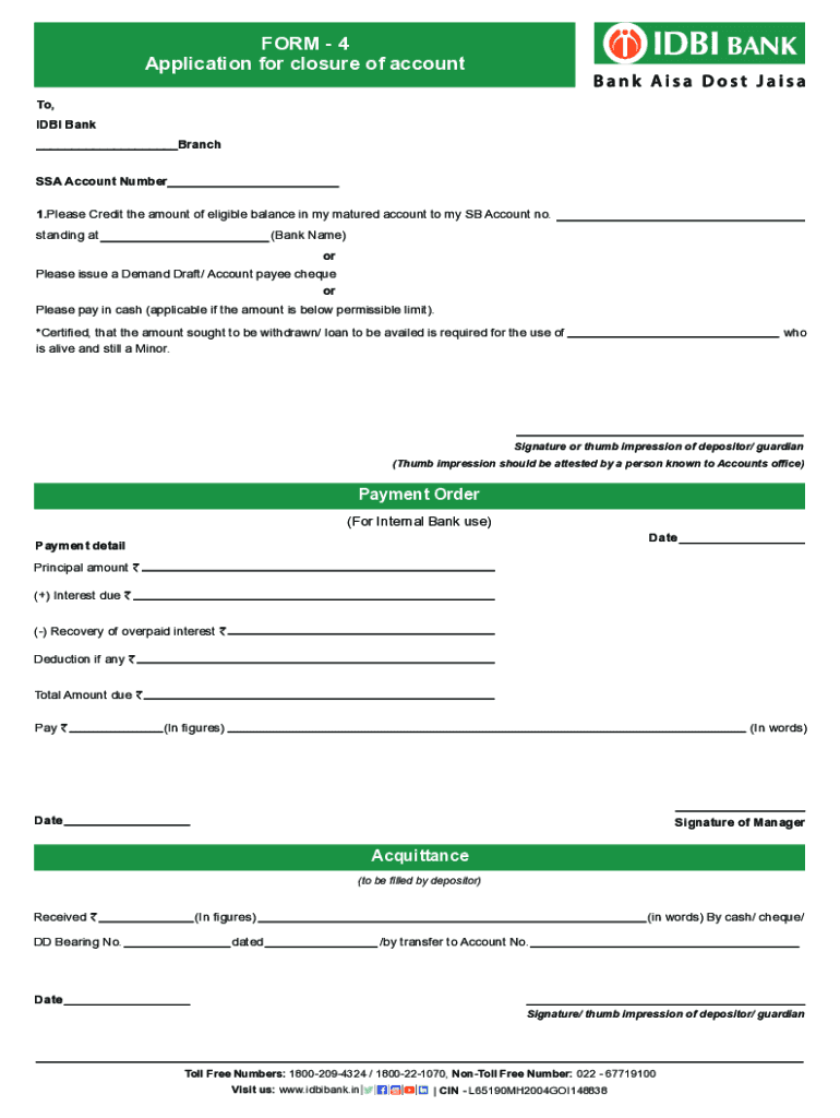 FORM 4 Application for closure of account To, IDB Bank ___Branch SSA Account Number 1. Please Credit the amount of eligible balance in my matured account to my SB Accounts no. standing at(Bank Name)