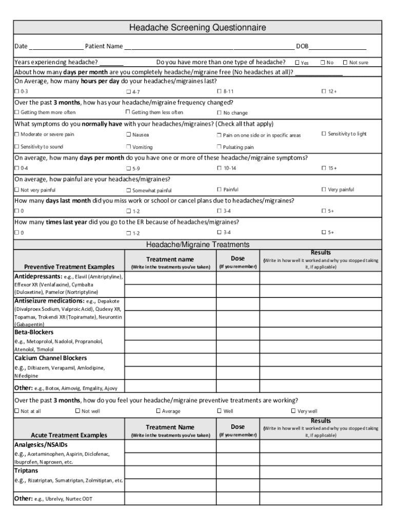 Headache Screening Questionnaire Date ___ Patient Name ___ DOB___ Years experiencing headache? ___ Do you have more than one type of headache? No Yes About how many days per month are you completely