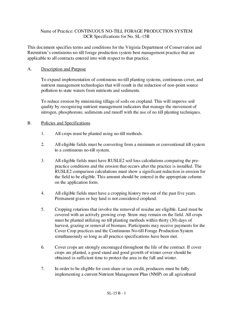 Name of Practice: CONTINUOUS STILL FORAGE PRODUCTION SYSTEM DCR Specifications for No. SL15B This document specifies terms and conditions for the Virginia Department of Conservation and Recreations