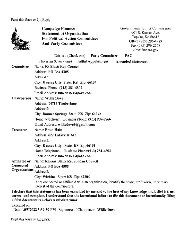 Print this form or Go BackCampaign Finance Statement of Organization For Political Action Committees And Party Committees This is a (Check one)CommitteeGovernmental Ethics Commission 901 S. Kansas